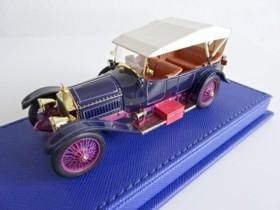 A l’extérieur, les phares avant, le radiateur avec son emblème, les avertisseurs, les marchepieds avec coffre à gauche et roue de secours et porte parapluie à droite, la malle arrière imitation osier, les feux arrière rendent cette miniature, immatriculée SV 8145, exceptionnelle. Les jantes à rayons sont de la couleur du châssis numéroté 20644.